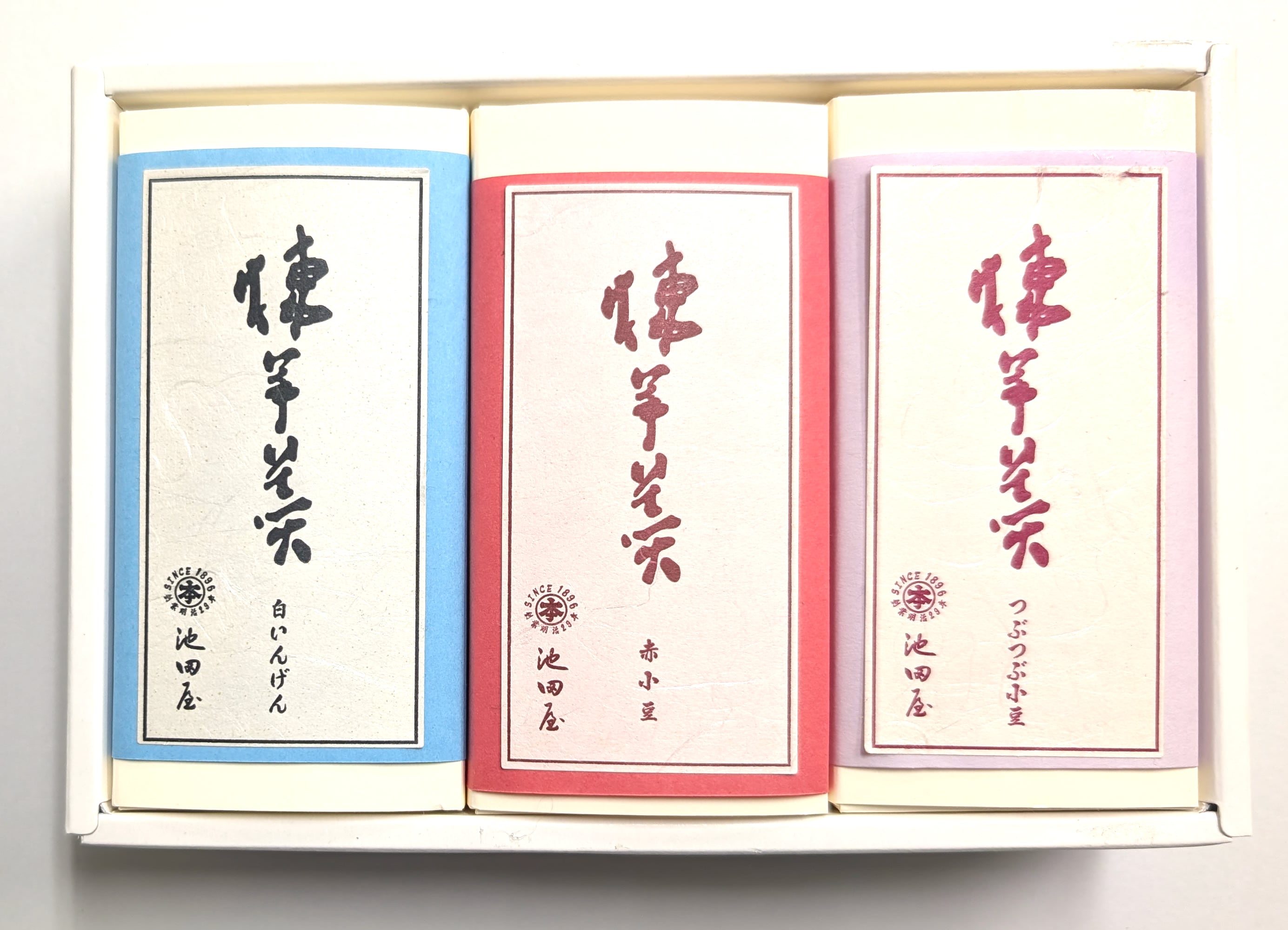 創業明治29年以来、令和の本日まで120年以上。本丸池田屋が最も長くつくり続けている煉羊羹のベスト3を箱入れにしたアソートセットです。製餡から梱包に至るまで頑なに技術を磨いており、現存する『片貝羊羹』は、本丸池田屋が唯一の語り部となります。