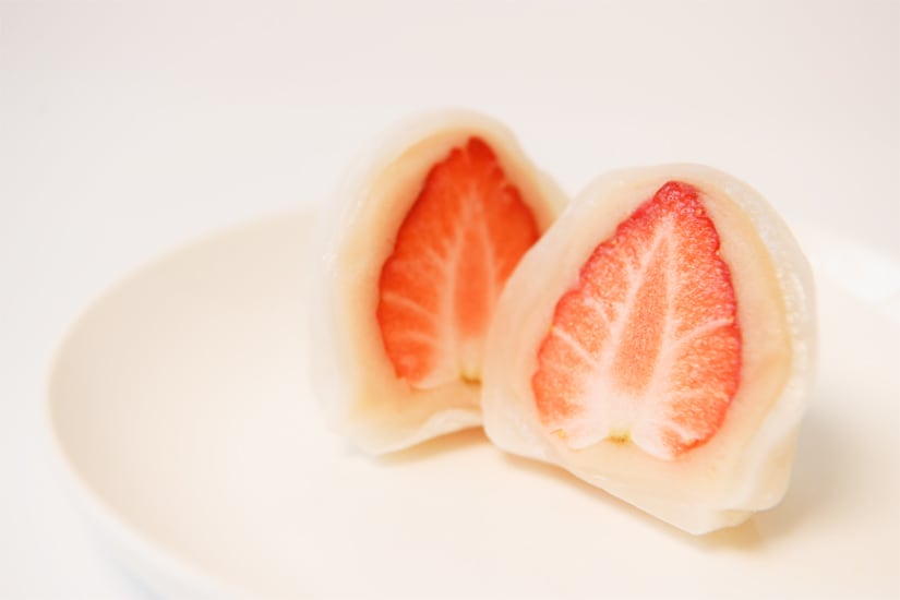 苺の香り、味わいを最大限に引き立てられるように、豆から炊いた白あんと、ほどよくはずむ羽二重餅で包んだ冬季限定のいちご大福です。とてもさっぱりとお召し上がりいただけるようにシンプルな原材料で素直な味を追求しております。